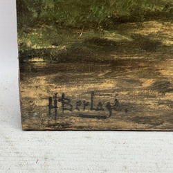 | Omschrijving | .Twee schilderijen.Olieverf op paneel. Boslandschap en visser op het meer Gesigneerd Hendrik Berlage (1856-1934) en onduidelijk gesigneerd meer gezicht gelijst. |