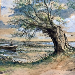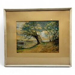 | Omschrijving | Aquarel op papier, opgehoogd met wit. Voorstelling van een Hollands landschap met bomen en visser in bootje bij de waterkant, verso titel 'de hengelaar'. Rechtsonder gesigneerd 'H. Edgo ft' = Hendrik de Groot (Havelte 1872 - Vries 1967), gedateerd 1961. |