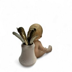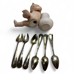 | Kavel | 2043. Heubach lepelvaasje met baby, en zes zilveren lepeltjes |