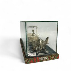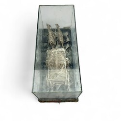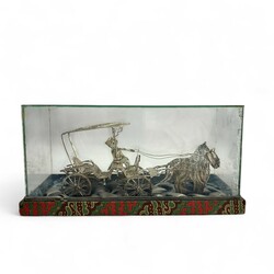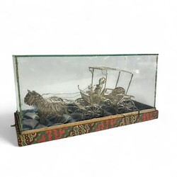 | Omschrijving | Een 20e eeuws zilveren of verzilverd filigrain model, Indonesisch, koets met twee paarden, in glazen vitrine. |