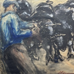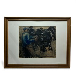 | Omschrijving | Een couach / kleurenkrijt tekening op papier. Koemarkt met boer en diverse koeien. Gesigneerd Jan Stroosma 1955. |
