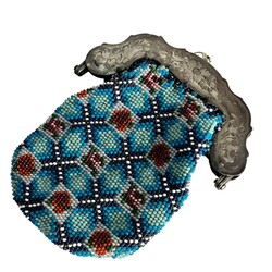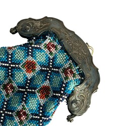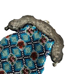 | Omschrijving | Een antiek 19e eeuws tweede gehalte (835/1000) zilveren beursbeugeltje aan kralentasje. |