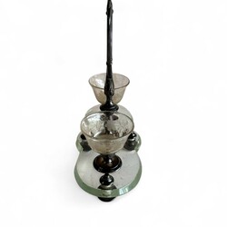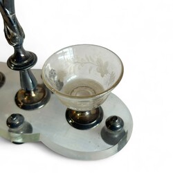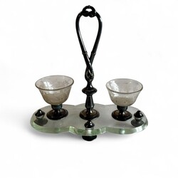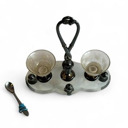 | Omschrijving | Een antiek kristallen peper-en zoutstel met verzilverd montuur. Op vier verzilverde pootjes, kristallen basement met inscriptie ‘Breveté’ en initialen, potjes op verzilverde voet en gegraveerd met bladeren en druiven, greep gemerkt ‘Th’ Henry . |