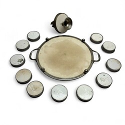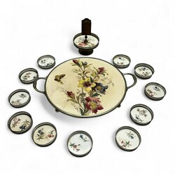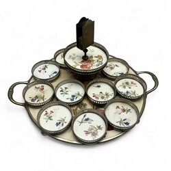 | Omschrijving | Een 20e eeuws Duits porseleinen dienblad in nikkelen montuur, op drie pootjes. Met twee grepen en daarbij elf bijpassende onderzetters en een luciferhouder |