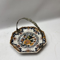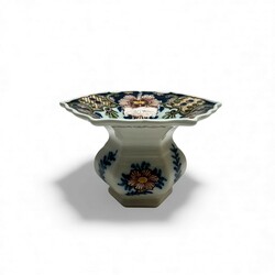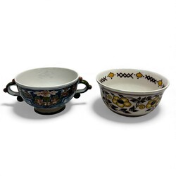 | Omschrijving | Lot divers 20e eeuws Tichelaar Makkum, waaronder een polychrome kwispedoor, twee kommen, een schaaltje met tweede gehalte (835/1000) zilveren beugel en een fruittestje op onderschotel. |