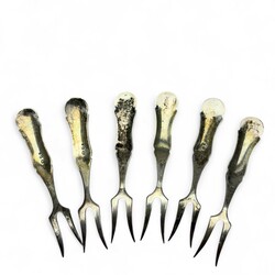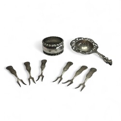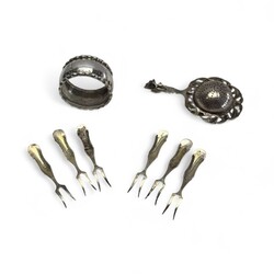| Omschrijving | Lot divers 20e eeuws tweede gehalte (835/1000) zilver: een set van zes zilveren vorkjes, biedermeier stijl, gemerkt N10 = Niekerk, Schoonhoven, jaarletter N = 1973. Met daarbij een Duitse gehamerde servetring, gemerkt ‘835’ en met monogram en een Nederlands theezeefje, opengewerkt met bloemdecor, Hendrik Hooykaas, jaarletter O (1949). |
