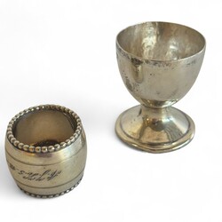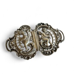 | Omschrijving | Lot divers zilver, waaronder een antieke 19e eeuwse zilveren gesp met rocailles en twee putti, servetring en deksel van een strooibus |
