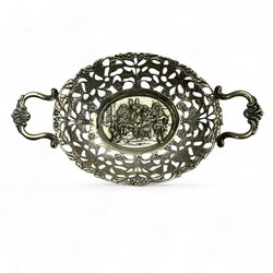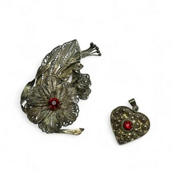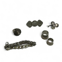 | Omschrijving | Lot divers zilver en verzilverd, onder andere een verzilverd mandje, tweede gehalte (835/1000) zilveren ring, Zeeuwse Knop, onedele broche gemaakt van Nederlandse munten, djokjazilveren broche en hanger, gemerkt ‘900”, een stel tweede gehalte (835/1000) zilveren oorbellen met onyx, twee zilveren vingerhoedjes, zilveren broche gemaakt van Willem III muntjes, zilveren armbandje en diverse colliers, o.a. zilver |