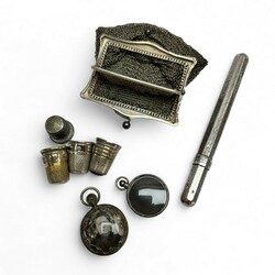 | Omschrijving | Lot divers zilver: een derde gehalte (800/1000) maliënkolderbeursje, een antieke 19e eeuwse tweede gehalte (835/1000) naaldenkoker, achtkantig model, rondom gegraveerd, twee medaillons, en enkele vingerhoedjes, waaronder twee zilver. |