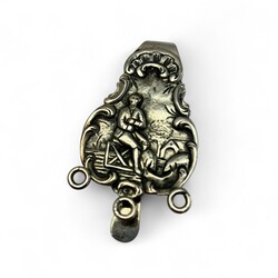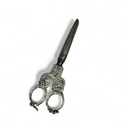 | Omschrijving | Lot diverse tweede gehalte (835/1000) zilveren attributen: een antieke 18e of 19e eeuwse naaischaar, een 20e eeuwse rokhaak in Louis XV stijl, van der Meulen Joure, een breinaaldenkoker en een zilveren montuur voor naaikussen. |