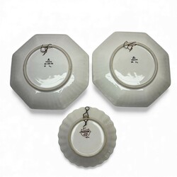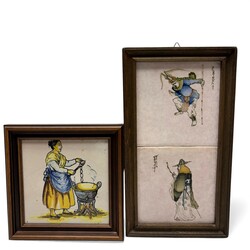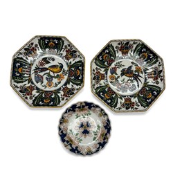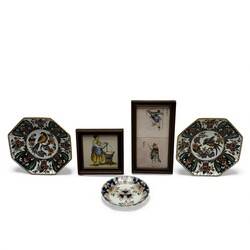 | Omschrijving | Lot diverse aardewerken borden en tegels: twee achtkantig polychroom gedecoreerde wandborden met afbeelding van vogel, gemerkt ‘Makkum’, een polychroom Tichelaar schoteltje, en drie tegels, waaronder twee Tichelaar tegels met voorstelling van Chinezen. |