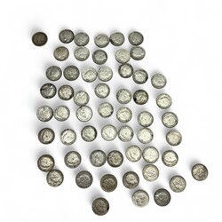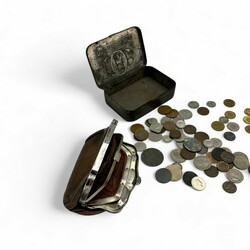 | Omschrijving | Lot diverse munten: o.a. een serie 10 cent munten, voornamelijk 1941, één munt met tekst ‘Rijkseigendom’ en ‘Militaire Apotheek’, 18e eeuwse munt Gelriae 1754, zilveren munt Zeeland 16.., 1x Utrecht 1759 etc. Met daarbij een lederen beursje met tweede gehalte (835/1000) zilveren montuur, gegraveerd, mr. LB = vermoedelijk L. den Besten, Schoonhoven, jaarletter G (1916). |