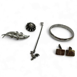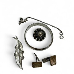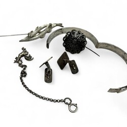 | Omschrijving | Lot diverse sieraden, voornamelijk zilver. Waaronder een filigrain bewerkte broche, Zeeuwse knoop, een stel tweede gehalte (835/1000) zilveren manchetknopen en een eerste gehalte (925/1000) zilveren slavenarmband. |