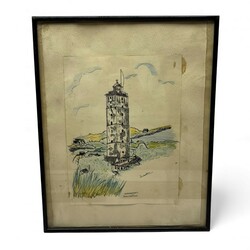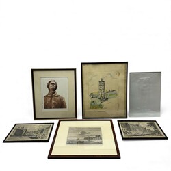 | Omschrijving | Lot diverse wanddecoraties, onder andere een tekening van de Brandaris, Terschelling, twee 18e eeuwse gravures ‘De kanselarij van Leeuwarden’ en ‘Stadhouderlijke Hof te Leeuwarden’, een glazen raam met afbeelding van de Oldehove en tekst ‘Open Huis 14.11.80’, een 18e eeuwse kopergravure ‘Franeker van den kant van Schalsum te zien’ en een inkttekening ‘Pottekeuning - Standbeeld voor de Regout fabrieken te Maastricht’. |