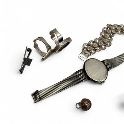 | Omschrijving | Lot diverse zilveren sieraden: een jaren ’70 tweede gehalte (835/1000) zilveren dameshorloge, Indus, op tweede gehalte band, twee design knijpringen, gemerkt ‘835’, een derde gehalte (800/1000) ronde broche met voorstelling van een koets, een tweede gehalte PTT speld, tweede gehalte zilveren armband, tweede gehalte collier met hanger, kreeft, gebroken collier, wereldbol hanger met 925/1000 zilveren montuur en tweede gehalte hanger, voetbal |