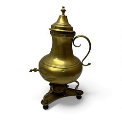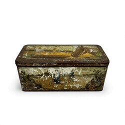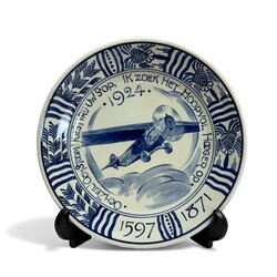 | Omschrijving | Lot diversen: een antiek ‘Sport’ sigarenblik met voorstelling van o.a. schaatsers en fietsers, een 18e eeuwse messing kraankan (beschadigd) en een Porceleyne Fles bord met opschrift ‘Och Zeil! Och Stoom! Kiest vrij uw sop, ik zoek het Hoopvol Hooger op - 1924’. Gemerkt Porceleyne Fles. |