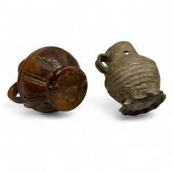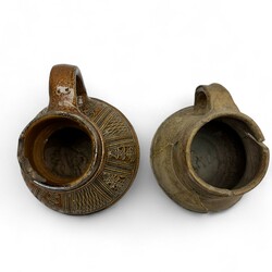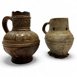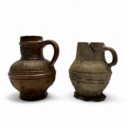 | Omschrijving | Twee steengoed kruiken: een bruingeglazuurde schenkkan met oor, ca. 1600 en een grijsgeglazuurde kruik met draairingen op de buik en hals, Siegburg, 15e eeuws. |