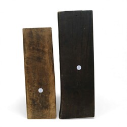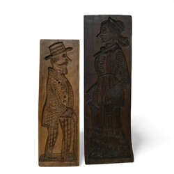 | Omschrijving | Lot van 2 grote koekplanken met een voorstelling van een man in pak en een vrouw in een jurk. |
