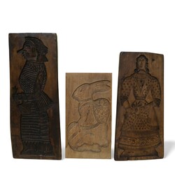 | Omschrijving | Lot van 3 grote koekplanken met onder andere een voorstelling van een haas en twee vrouwen. |