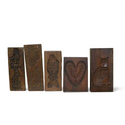 | Omschrijving | Lot koekplanken met onder andere een voorstelling van een hart, een vis, een kat en verschillende personen. Het hart is met ijzer afgewerkt en één van de planken is gesigneerd AD. |