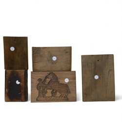 | Omschrijving | Lot koekplanken met onder andere een voorstelling van een hond, ruiters en paarden en diverse dieren en personen. Één van de planken is op de achterkant gesigneerd met BJ. |