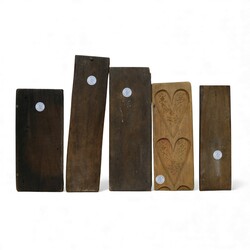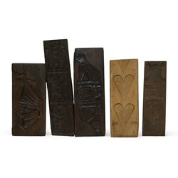 | Omschrijving | Lot koekplanken met onder andere een voorstelling van een molen, harten, een schip en diverse dieren. Één van de planken met dieren is afgewerkt met een ijzere rand. |