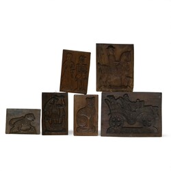 | Omschrijving | Lot koekplanken met onder andere een voorstelling een auto, een kat, een leeuw, paard en wagen en diverse personen. Één van de planken is op de achterkant gesigneerd met PTH en een ander met HK. |