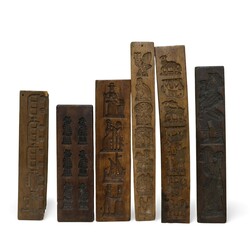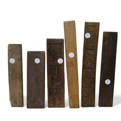 | Omschrijving | Lot koekplanken met onder andere een voorstelling van een trein en diverse personen, dieren en figuren. Één van de planken is op de zijkant gesigneerd met WK. |