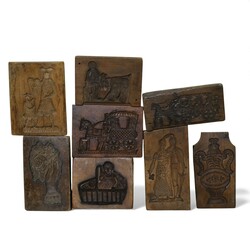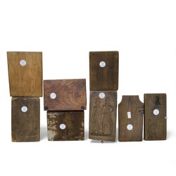 | Omschrijving | Lot koekplanken met onder andere een voorstelling van paard met koets, een geit, een vaas en diverse personen. De plank met de vaas is op de voorkant gesigneerd met JC. |
