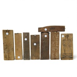 | Omschrijving | Lot koekplanken met onder.andere een voorstelling van een zwaard, een koek waar 'Jan Hagel' instaat en diverse personen en figuren. Twee van de planken zijn op de zijkant en achterkant gesigneerd waarvan één met IR en de ander HK. |