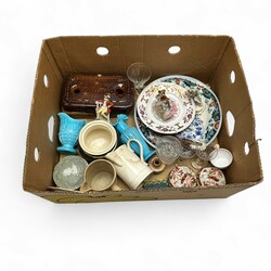 | Omschrijving | Lot met divers aardewerk en porseleinen artikelen. Bestaande uit stroopkannen, Tichelaar schotel, Franse warmte stenen, antieke glazen en opaline vaas. |