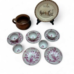 | Omschrijving | Lot divers porselein en aardewerk: een Sarreguimes Enfant bordje, vijf 18e of 19e eeuwse bietenrood kop en schotels en een steengoed potje. |