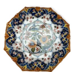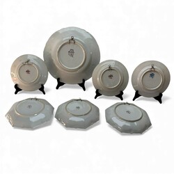 | Conditie | Grote schotel met enkele randchips, spreukschotels in goede staat, achtkantige borden met minieme flinters van puntjes |