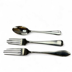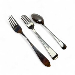 | Omschrijving | Lot van drie 20e eeuwse tweede gehalte (835/1000) zilveren vorken en lepels, één vork onduidelijk gemerkt, jaarletter H (1917), lepel gemerkt Voorschoten, vork met puntfilet A.J. Driessen, jaarletter D (1938) |