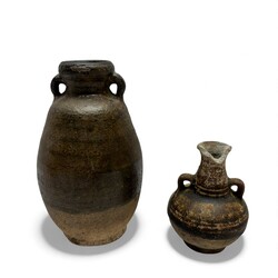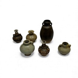 | Omschrijving | Lot van zes stuks Thaise Sawankhalok aardewerk. Bestaande uit miniatuur kruikjes, enkele met oortjes. In bruine en celadon glazuren. 15e eeuws. |