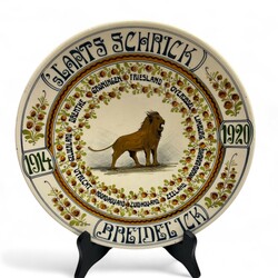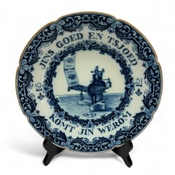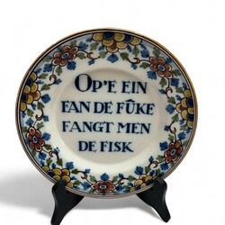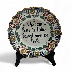 | Omschrijving | Lot diverse wandborden: een blauw-wit Tichelaar wandbord met afbeelding van een drukpers (?) en tekst ‘Jins goed en tsjoed komt jin werom’, gedateerd 1951, twee spreukborden met tekst ‘Op ‘t ein fan é fuke fangt men de fisk’, één Tichelaar, één Workum en een vroeg 20e eeuwse schotel met tekst ‘s Lands schrik Breidel ick’ en datering 1914-1920. |