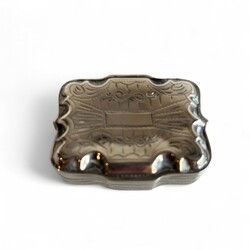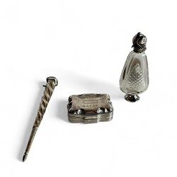 | Omschrijving | Lot divers 19e en 20e eeuws tweede gehalte (835/1000) zilver: een 20e eeuws pillendoosje, gegraveerd op de deksel, mr. van der Meulen, Joure, een 19e eeuwse kristallen parfumflacon met zilveren voet, plaquette, hals en dop (dop beschadigd) en een 19e eeuwse getorste breipenhouder, mr. Brunings, Joure. |