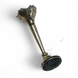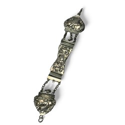| Omschrijving | Lot zilver: armband gemaakt van een 18e eeuws zilveren Bijbelslot, aan de achterzijde gegraveerd met stippelgravure ‘1798’, een 19e eeuws zilveren beursbeugeltje, jaarletter D (1888), een 19e eeuwse naaldenkoker en een vaasje, gebroken. |