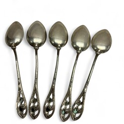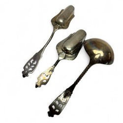 | Omschrijving | Lot divers 20e een tweede gehalte (835/1000) klein schepwerk, bestaande uit vijf theelepels met opengewerkte steel en voorstelling van sneeuwklokje, buitenlands, gemerkt ‘835’ en ‘CW’, en een driedelige set (theeschepje, suikerschepje en roomlepel) met getorste, gegraveerde en opengewerkte steel, gemerkt met zwaardje en meesterteken ‘vdM77’ = van der Meulen, werkzaam te Joure van 1902 tot 1925. |