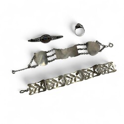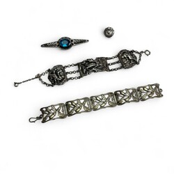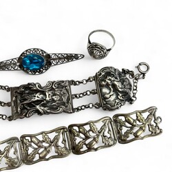 | Omschrijving | Lot divers tweede gehalte (835/1000) zilver: twee armbanden, waaronder één in de stijl van een bijbelslot, gemerkt Hooykaas, een ring en een broche, filigrain bewerkt en met blauwe steen. |
