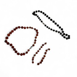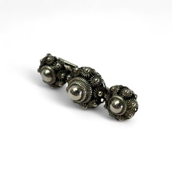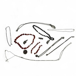 | Omschrijving | Lot diverse zilveren sieraden, waaronder een Duitse derde gehalte (800/1000) zilveren hanger, gemerkt 'Handarbeit', aan tweede gehalte (835/1000) zilveren jasseroncollier, twee tweede gehalte zilveren breipendoppen, enkele sieraden met Zeeuwse knoop en diverse eerste (925/1000) zilveren colliers. Met daarbij een granaten en carneolen collier. |