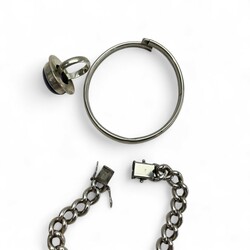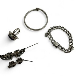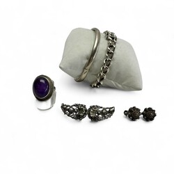 | Omschrijving | Lot van vijf zilveren sieraden: een tweede gehalte (835/1000) zilveren slavenarmband, een eerste gehalte (925/1000) zilveren schakelarmband, een eerste gehalte (925/1000) zilveren ring met paarse steen, en twee broches, één gemaakt van Zeeuwse Knoop en één gemaakt van twee oorijzerspelden. |