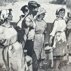 | Omschrijving | Grote litho op papier, voorstelling van mannen en vrouwen met melkemmers in de Sovjet-Unie. Rechtsonder gesigneerd Michail Andreichuk (Nekhvoroshchi 1927 - 2019), gedateerd 1962. |