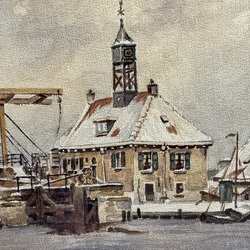 | Omschrijving | Aquarel op papier, voorstelling van de sluis bij Hindeloopen. Rechtsonder gesigneerd Pieter van der Brug (Workum 1897 - Hindeloopen 1993). |