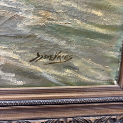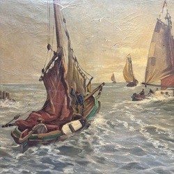 | Omschrijving | Schilderij, olieverf op doek. Vissersschepen op de Zuiderzee, rechtsonder gesigneerd Sjoerd de Vries (Franeker 1909 – Alkmaar 1996). |