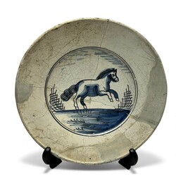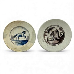 | Omschrijving | Lot van twee antieke 18e eeuwse aardewerken wandbordjes, mangaan en blauw-wit. Eén met voorstelling van springend paard, één met landschapsdecor. |