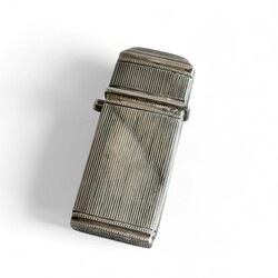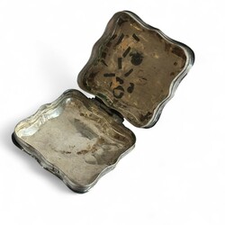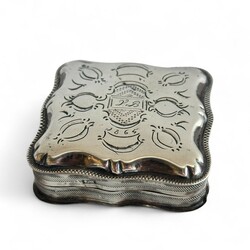 | Omschrijving | Lot van twee antieke 19e eeuwse tweede gehalte (835/1000) zilveren pillendoosjes en een 19e eeuws tondeldoosje. Eén rond pillendoosje, meesterteken DK2 = Cornelis van Dam Kooijman, werkzaam te Schoonhoven, jaarletter H (1842), één vierkant pillendoosje, aan de bovenzijde gegraveerd met initialen ‘VB’ en datering 1864, ongeïdentificeerd meesterteken, jaarletter E (1864). En een tondeldoosje, geribd, meesterteken G109 = Gerrit Rechtdoorzee Greup, Schoonhoven 1864 tot 1888. |