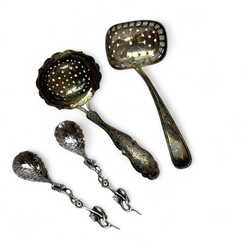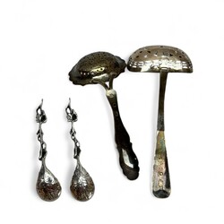 | Omschrijving | Lot van twee antieke 19e eeuwse tweede gehalte (835/1000) zilveren strooilepels: één met filetrand en sterretjespatroon in de bak, mr. HD31 = Hermanus van Delden, Zwolle, periode 1814 tot 1858, jaarletter W (1831), en één gegraveerd, met gecontourneerde bak, mr. 10R = mr. Reitsma, Heerenveen en Sneek, periode 1859 tot 1892, jaarletter k (1869). Met daarbij twee 20e eeuwse tweede gehalte (835/1000) zilveren theelepels, naturalistische stijl met bladvormige bak. |