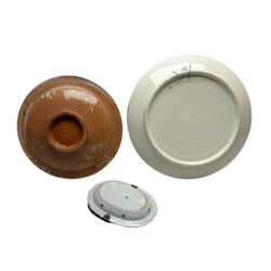 | Omschrijving | Twee aardewerken schotels,Spaans en Marrokaanse. Beide polychroom beschilderd. Hierbij een Tichelaar, Makkum presenteerschaaltje aan een 2e gehalte (835/1000) zilveren beugel. |