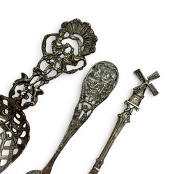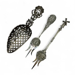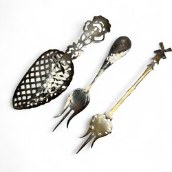 | Omschrijving | Lot van twee 20e eeuwse tweede gehalte (835/1000) zilveren cakeprikkers, met daarbij een natfruitschep. Eén cakevork met Nachtwacht- en herbergdecor, de andere gedeeltelijk opengewerkt, met landschapsdecor en bekroond met windmolen, de natfruitstijl in renaissancestijl, mr. Z/Z = Zaanlandse Zilversmederij, Haarlem, jaarletter A (1960) |